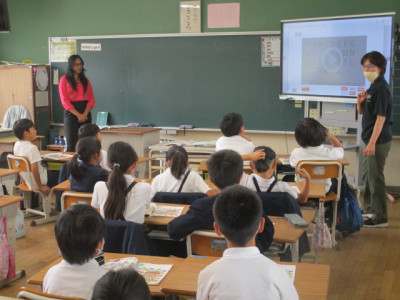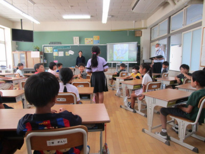 3年生教室では、ALTのパトリシアと一緒に外国語活動の授業が行われていました。今日の授業では、アルファベットの大文字に慣れて、ゲームなどを通してコミュニケーションを図る活動となっていました。アルファベットの文字や発音を電子黒板で確認したり、パトリシアから生の英語の発音を聞かせてもらったりして楽しく学習することができました。