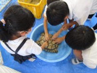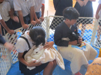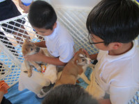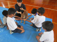 動物愛護センターからは2名の職員が来校され、犬(成犬1頭、仔犬5頭)、リクガメ、ウサギ、モルモットなどの動物を連れて来てくださいました。45分ずつの時間設定で、低学年、中学年、高学年と順番にご指導いただきました。