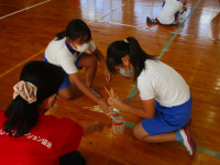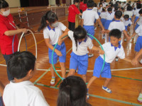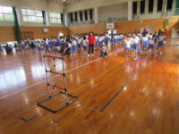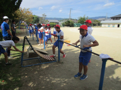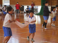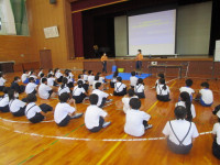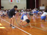 午後から、愛媛県レクリエーション協会の方に来ていただき、全校でチャレンジ・ザ・ゲームを行いました。ねらいは、「友達と協力して楽しく過ごす」です。太陽の子グループ(縦割り班)に分かれ、様々なゲームを楽しみました。ゲームの内容は、「フープくぐり」「タオルでボール運び」「フープトンネル」「割りばし出し入れ」「スピード・ラダー・ゲッター」です。写真から、子供たちの楽しそうな様子が伝わってくるのではないでしょうか。