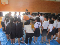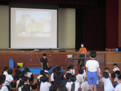 今日は、動物愛護センターから動物ふれあい教室の出前授業がありました。これは、道徳教育の一環として、学校から依頼したもので、「動物とのふれあいを通して、命の大切さを感じたり、相手(動物)との接し方について考えたりする」ことをめあてに企画しました。