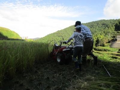 今日は、4年生が泉谷の棚田で稲刈り体験をしました。棚田を管理されている上岡さんから指導を受けながら、稲刈りに挑戦です。男子は、最初に稲刈り機を使わせていただきました。機械の操作も丁寧に教えていただき、子供たちは上手に操作して稲刈りが進んでいきました。また、女子は、稲刈り鎌をつかって手刈りをしていきます。刈り取った稲を12のまとまりで集め、わらを使って束ねる作業にも挑戦しました。慣れない手つきでしたが、みんな楽しく一生懸命に作業していました。