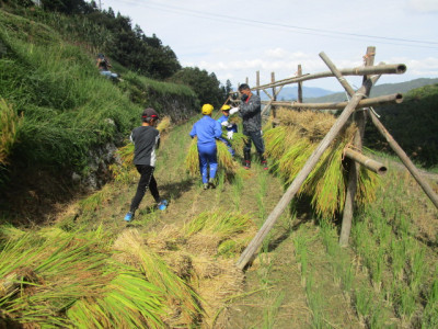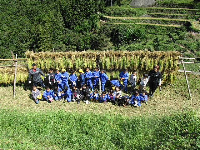 刈り取りが終わると、束ねた稲を稲木に掛けていきます。最近では、稲木で稲を干すところは少なくなってきていますが、手間暇をかけると、その分おいしいお米になるのでしょう。この作業も先生や子供たちが協力して、最後までやり遂げることができました。最後に記念撮影も行いました。
