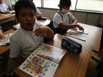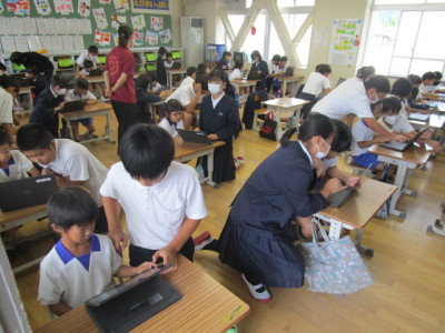 1年教室をのぞいてみると、いつもより人数が多い上に、体格のいい児童がたくさんいます。どうしたのかなと思ってよく見てみると、6年生が1年生にタブレットの使い方を教えてあげているところでした。タブレットに届いたアンケートに答える作業のようですが、まだまだタブレットの操作に慣れていない1年生にとっては一苦労。そこを6年生が優しく丁寧に教えてあげていました。とてもほのぼのした感じがします。教えてもらう1年生もうれしそうです。