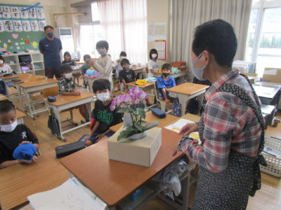4年生は、水生生物の調査に小田川に出かけています。この様子はまた後日お知らせします。4年生といえば、先日、米田さんをお迎えして道徳の授業を行いました。昨日の午後、米田さんがまた来校されました。先日、子供たちと関わることができてとても嬉しかったので、お礼にとお花を届けてくださいました。紫色のかわいい胡蝶蘭をいただきました。子供たちは大喜び。これから4年生教室で花を楽しむとともに大切に育てます。ありがとうございました。