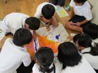 後半には、グループに分かれ、大きな地図に自分の家の場所、危険な範囲、いざという時の避難場所を協力して書き込み、災害が起きた場合にどのように行動すべきか考えることができました。