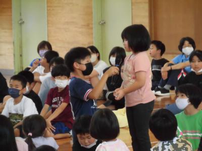 感想発表の時間になると、たくさんの子供たちが感想を言おうと立って意思表示をしていましたが、時間の関係で各学年一人ずつになりました。子供たちからは、「1年生が喜んでくれてうれしかった」「全校ゲームをみんなで楽しめてよかった」といった感想が聞かれました。どの学年の発表も1年生を意識した内容で、表現力そしてチームワークに富んでいて集会を全校で楽しむことができました。