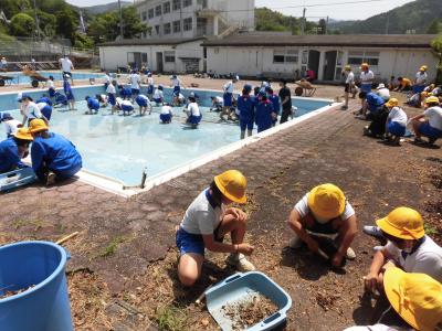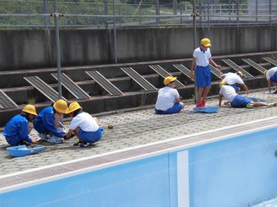 本日、3・4校時にプール掃除がありました。天神小のプールは五十崎中学校と共用のため、中学生が下準備や大変なところを担当してくれます。小学校からは、5・6年生の子供たちがトイレやプール周辺の草引きを頑張ってくれました。全体的にきれいなプールではありますが、プール周辺のタイルのすきまから雑草がたくさん生えていて、小学生もなかなか大変な作業でした。
