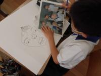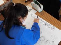 2年教室です。子供たちが一生懸命人権ポスターを描いていました。友達が仲良く活動している写真を手がかりに絵を描いていました。大胆なタッチで画用紙一面に楽しそうな絵ができています。