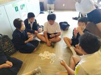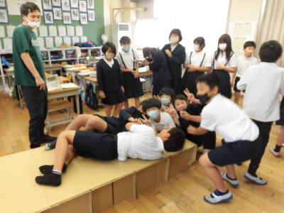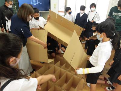 5時間目から6時間目にかけて、5年生は総合的な学習の時間に防災をテーマに学習しました。内子町役場の危機管理班の方から防災や減災についてご説明いただきました。授業の後半には、段ボールベッドを作る活動がありました。みんなで試行錯誤しながらベッドができあがると大盛り上がり。順番に完成した段ボールベッドに寝転んで寝心地を確かめていました。