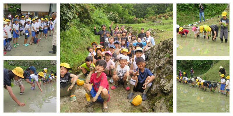 5月25日(木)、4年生が田植えの体験をしました。場所は、「日本棚田百選」に選ばれている、御祓地区泉谷の棚田です。とても、美しい景観です。