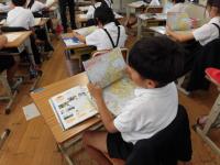 3年生教室では、教頭先生が受け持つ社会科の授業。今日は地図帳の見方を勉強していました。地図帳の縦に並ぶ数字と横に並ぶ記号から場所を見つけることを覚えます。友達同士で教え合う姿が微笑ましかったです。
