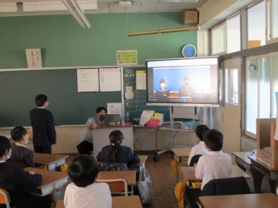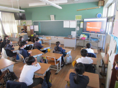 今日は、5時間目に町内の全小中学校がオンラインでつながり、ふるさと学習交流会を実施しました。参加する学年は、学校によって様々でしたが、天神小学校からは4年生が参加しました。この交流会は、今年度から始まった取組になります。各小中学校で取り組んでいるふるさと学習の成果を交流することで、より内子のことを知り、郷土愛を深めることを目的としています。