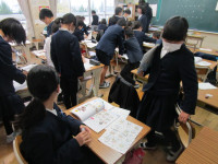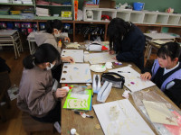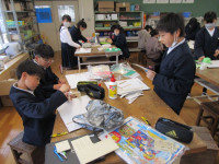 最後に校長室の様子です。校長室は、卒業証書の仕上げに大忙しです。6年生が紙漉き工場で漉いた紙が卒業証書となって学校に届きました。一人一人が漉き上げた和紙に、間違わないように丁寧に名前等を書いています。和紙は独特の質感があり、筆で書くには苦労しています。あまり上手とは言えませんが、心を込めて書かせていただいています。そして、一人一人の名前に込められた家族の思いや愛情も感じているところです。6年生のみなさん、これからもいろいろな方からの愛情を受けながら、健やかに成長していってくださいね。