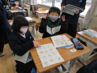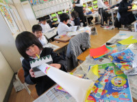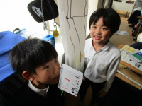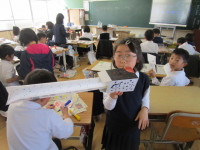 さて、今日は3時間目の授業の様子を紹介します。1年生教室では、「にょきにょきとびだせ」という教材を使って工作に取り組んでいました。細長いナイロン袋の先にストリーが付けられており、箱の中に格納するようになっています。ストローから息を吹き込むと箱の中からナイロン袋が棒のようになってとびだす仕掛けです。子供たちは、好きなキャラクターや動物などを描いて楽しい作品を作っていました。ハサミを器用に使い、絵も上手に描けています。