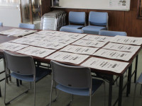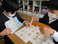 3時間目に4年生の授業をのぞいてきました。今日は、パトリシアと一緒に外国語活動に励んでいました。内容は、方角を表す表現を使いながら、友達に自分の行きたい場所を道案内する活動です。「ゴー・ストレイト」「ターン・ライト」「ターン・レフト」を使い分けながら、紙の上に並んでいる建物や場所の中にある目的地まで消しゴムを駒のように動かしながら案内していました。「校長先生も一緒にやりましょう」と誘ってくれたので、数人の子供たちと一緒に活動を楽しみました。外は雨模様ですが、みんな生き生きと活動していて、4年生教室は晴れ晴れしていました。