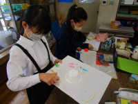 図工室では、5年生が図画工作科の授業で作品を作っていました。こちらは、一枚の板の上に迷路を作り、ビー玉を転がして遊ぶおもちゃを作っていました。5年生は、糸のこも使えるようになり、形も思いのままにできます。空き容器を工夫してトンネルをつくったり、アイスの棒で道を作ったり、廃材も上手に使っていました。出来上がりが楽しみです。