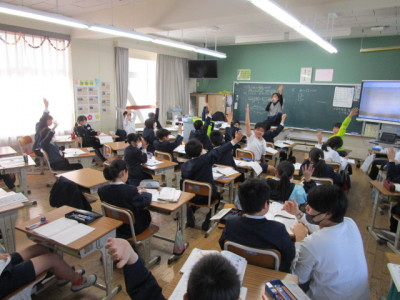 3年教室では、みんなが算数の問題を熱心に解いていました。はじめの数80にあとからいくつかもらうと全体の数が110になるという文章問題でした。線分図や四角を使った式を使いながら、頭をひねって答えを導き出していました。ノートの取り方がとてもきれいで分かりやすい児童が何人かいました。学習したことをきちんとノートにまとめることができると力がつくと思います。先生が「この問題分かる人」と声を掛けると、たくさんの子供たちが手を挙げていました。