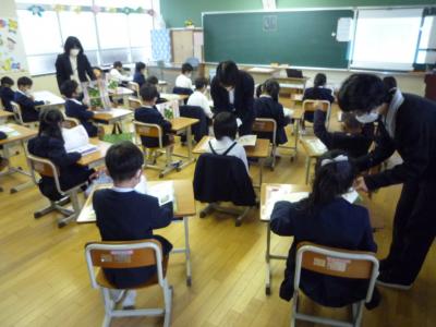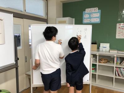 1年教室では、自分の名前をひらがなで書く練習をしていました。「ゆ」「わ」「や」などは難しいと思いますが、先生に教えてもらいながらきれいに書くことができました。