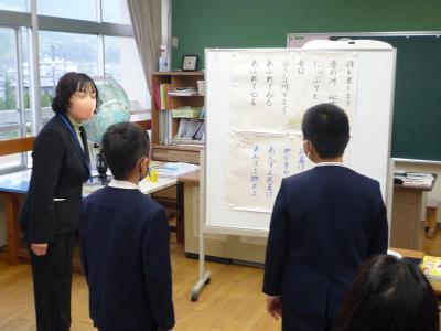 2年教室では書写の学習をしていました。ん?みんな頭に手を組んで何をしているのかなと思われるでしょうが、これは書写のウオーミングアップ「しょしゃたいそう」なのだそうです。体も心も整えることで美しい文字が書けるのでしょう。