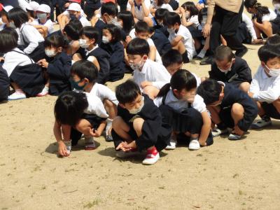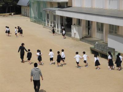 煙に備えて口を覆って逃げる高学年の子供もいました。避難場所は、運動場の鉄棒前です。どの学年も真剣に避難することができました。