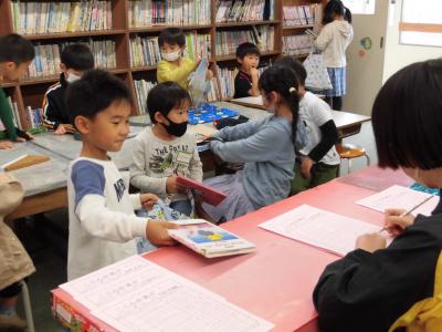 続いて、図書室では、1年生が図書の本を借り換えしているところでした。図書室前にきちんとシューズを並べて入室すると、順番に先生のところに返す本を持って行きます。その後、新しく借りる本を探して借りる作業をするのですが、なかなか台本板が見つからなかったり、高いところの本は届きにくいので先生や支援員さんの助けを借りたりと苦労している様子が見られました。たくさんの本を読んで、本好きな子供になってほしいと思います。