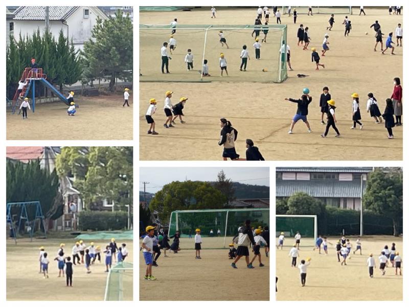 12月9日(金)の昼休み。今日は、とってもよいお天気です。晴れた日はいつも、元気よく外で遊ぶ子供たちと先生の姿が・・・。子供も先生も汗だくになって、めいっぱい遊びます。広い運動場いっぱいに駆け回ったりボール遊びしたり、遊具遊びしたり・・・。そんな元気な天神の子供たちのエネルギーは無限大!先生たちのパワーも無限大!