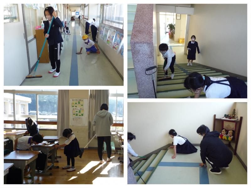 12月12日(月)、昼休み終了後子供たちは各清掃場所に移動して清掃活動に取りかかります。清掃活動班は太陽の子グループの縦割り班です。高学年がリーダーシップをとって、下学年に掃除のやり方を教えたり手伝ったり・・・。自分たちの使う場所を自分たちの手できれいにしていきます。