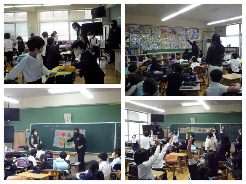 12月13日(火)。毎週火曜日はALTのパトリシア先生に来ていただき、3・4年生が外国語活動、5・6年生が外国語の授業でお世話になっています。そして、6時間目は2年生の教室にも来ていただき、外国語に親しむ授業に参加してもらっています。