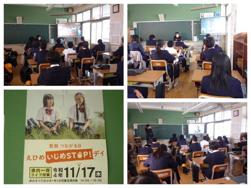 11月17日(木)の5・6時間目、6年生が「えひめいじめSTOP!デイ」に参加しました。こては、県内全ての小中学校をオンラインで接続し、いじめの起こりにくい学校づくりに向けて、子供自身が主体的にいじめ防止について考え、話し合うものです。県内一斉ライブで行われ、本校6年生にとっても、県内小中学生の意見を聞いたり発表を見たりして、「いじめ」について真剣に考えることができるよい機会となりました。