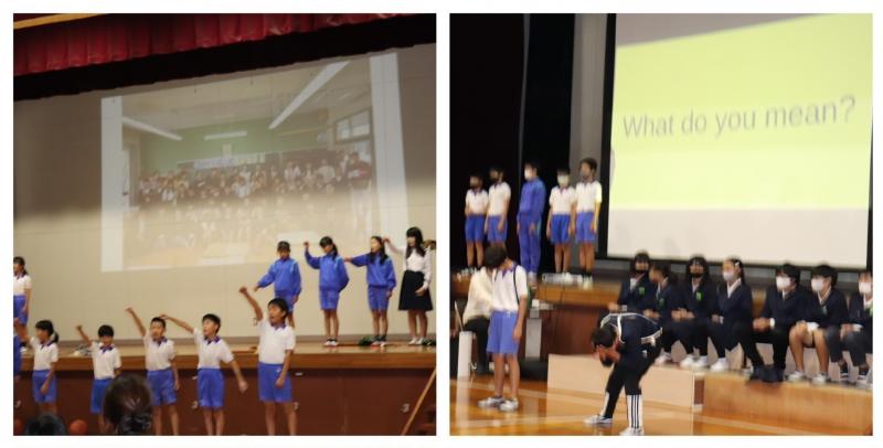 11月8日(火)、今日は掃除の時間を天神タイムに変更して、まごころ集会を行いました。まずは、3人組に分かれて「ぴったりじゃんけん」ゲームです。3人組は、みんな違う学年で作ることが条件です。そして、じゃんけんは英語で行います。パトリシア先生と竹内先生がお手本を見せてくれて、いざ開始!"stone paper scissors one two three." の掛け声でじゃんけんをします。3人全員がそろったら座ります。みんな、すごく楽しそうです。このゲームを3回ほど繰り返し、最後の3人組で「木とリス」のゲーム開始。木の役2人、リス役1人で、「オオカミが来たぞ」でリスだけ移動、「木こりが来たぞ」で木が移動、「嵐が来たぞ」で全員が移動します。全てのゲームにパトリシア先生も参加していただきました。ゲームが始まると、みんなすぐに夢中になり、あっという間に時間が過ぎて行きました。(*^_^*)