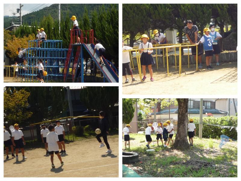 9月30日(金)の昼休み、青空の下元気に遊ぶ子供たち。いつも昼休みには子供たちと一緒に遊ぶ先生たちの姿も・・・。鬼ごっこしたり、サッカーボールで遊んだり、遊具で遊んだり・・・。低学年の子供たちの中には虫かごと虫取り網を持って昆虫探しをしている子もいます。