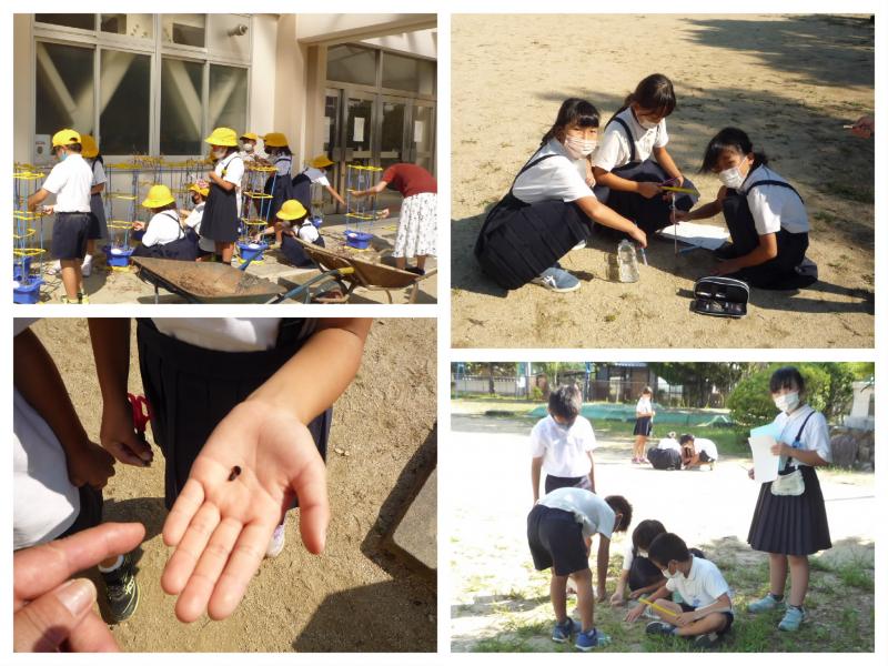出発するときみんな口々に「いっぱいバッタ取ってくるよ。」「コオロギ探してきます。」等、意欲満々の様子。その後、河原に様子を見に行くと・・・。「見てください、トノサマバッタ。」「たくさん取れました。」「すごく大きいバッタです。」等々、虫かごとともに集まってくる子供たち。本当に、たくさんの昆虫を集めることができたようです。