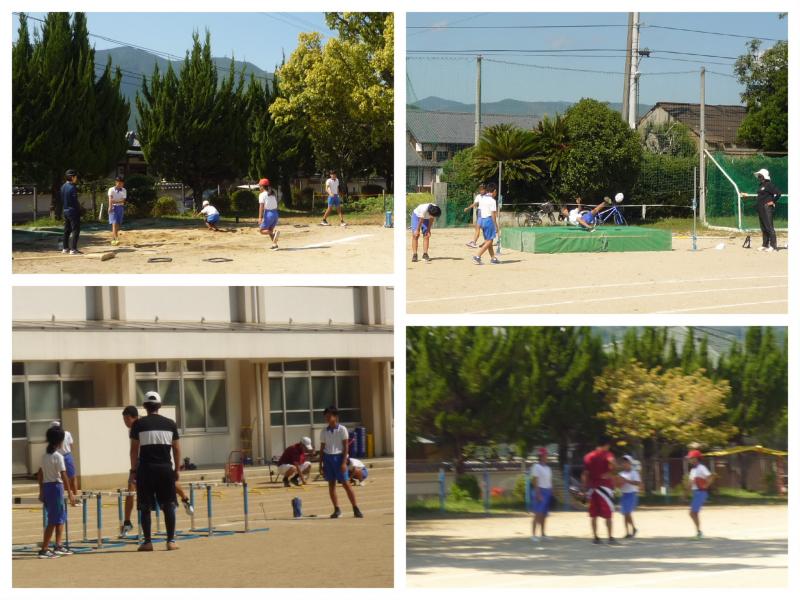 10月1日、秋晴れの爽やかな土曜日。今日から10月です。本校運動場では、午前9時から11時30分までの予定で、子供たちが陸上練習を頑張っています。最初は全員で準備の運動や走り込みなど基礎的な運動をした後、それぞれの種目に分かれて練習します。子供たちは今、担当の先生たちとともに、10月14日に開催される喜多郡陸上大会出場に向けて、真剣に練習に取り組んでいます。自己ベストを目指し、ひたすら練習に打ち込む姿は、今日も輝いています。