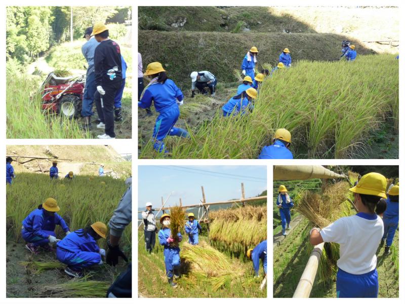 10月3日(月)の2~4時間目、4年生の子供たちが御祓地区泉谷の棚田にスクールバスで出かけました。4年生は総合「ふるさと学習」で田植え体験をしました。今回はその棚田で稲刈り体験をさせていただきます。これは、泉谷地区の上岡さんのご厚意で行っています。今日も、地域コーディネーターの小野さんも一緒です。子供たちは上岡さんに教えてもらいながら、上手に鎌を使って稲刈り体験をしtました。中には、バインダーを使っての稲刈りも体験させていただいた子もいます。