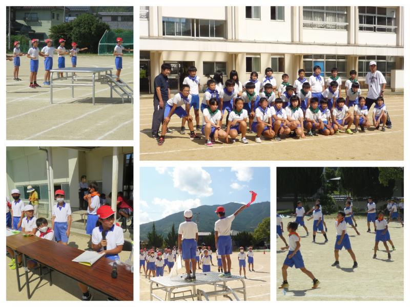 10月3日(月)の3・4時間目、5・6年生がミニ運動会を行いました。これは、運動会当日全員がそろわずせっかく練習した係や演技ができなかったことに悔いが残るので、もう一度ミニ運動会として開催したいという6年担任の提案から実現したものです。5年生は協力という形で、一緒に参加してくれました。開会式から閉会式までを全て実施し、記念写真もパチリ!
