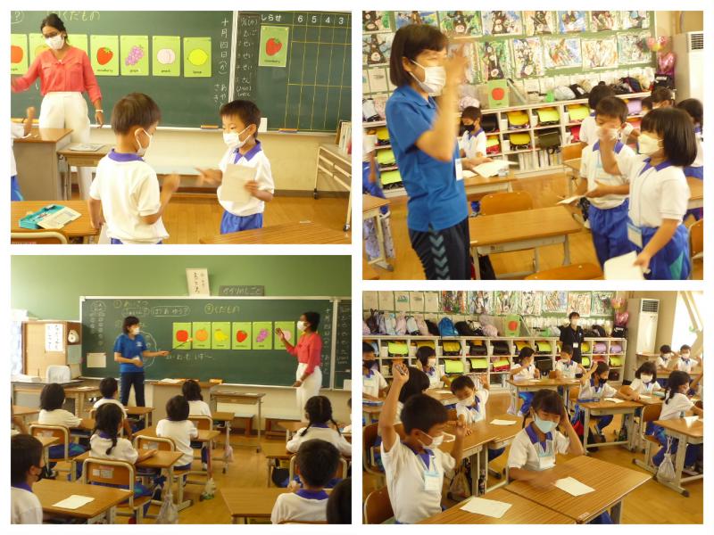 10月4日(火)の1時間目、パトリシア先生に来ていただき、1年生が英語遊びを楽しみました。まずはじゃんけんゲームでリラックス。じゃんけんに勝ったら負けた相手が名前を書いてくれます。何人集めることができるかな?・・・チャンピオンはなんと!?(1年生の子供たちに聞いてください。笑笑)