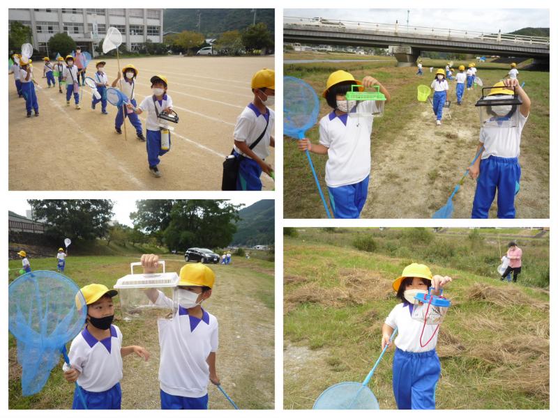 10月4日(火)の2時間目から、1年生は豊秋川原に虫取りに出掛けました。地域コーディネーターの小野さんも一緒です。毎年、この時期に生活科で虫取りを行っています。