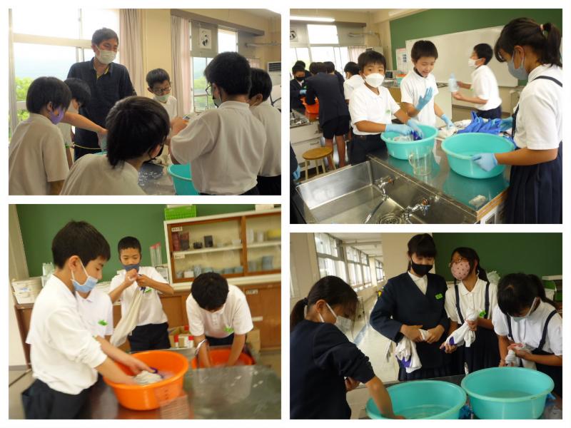 6月13日(月)の5・6時間目、6年生が洗濯実習をしました。6年生は、家庭科の学習で「暑い季節を快適に過ごす」という内容で学習を進めています。快適に過ごすためには清潔さを保つことも大切です。今日は、体操服やTシャツ、タオルなど、自分たちで考え持ち寄った物を洗濯していきます。どの部分が汚れているのかを確認し、たらいに水を張り洗剤を入れて「もみ洗い」「つまみ洗い」「おし洗い」と、汚れの度合いに合わせた方法で洗いました。きれいな水で数回すすいだ後、しっかり絞って、しわを伸ばして干しました。