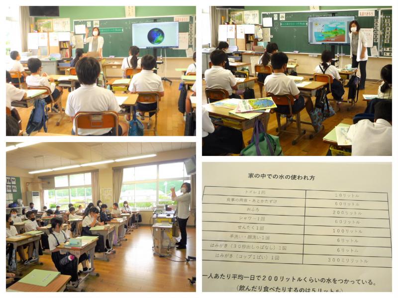 6月14日(火)の3・4時間目、地域コーディネーターの小野さんにゲストティーチャーとして入っていただき、4年生が「水」に関する授業を行いました。子どもたちは、資料を見たりお話を聞いたりする中で、自分たちの生活にとって水は大変貴重な資源であるということや、世界に比べて日本の水は安全だと考えられること、蛇口をひねって水が出ることのありがたさ等を学ぶことができました。