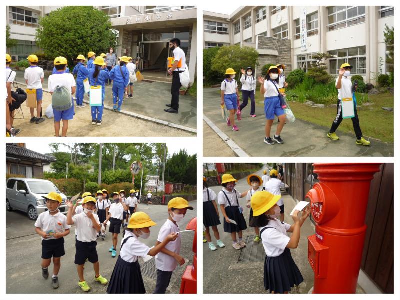 2年生は、国語の時間に書いた葉書を近くのポストに出しに行きました。自分が書いた葉書を自分の手でポストに入れる経験が、「郵便の仕組み」への気付きと感動につながることでしょう。