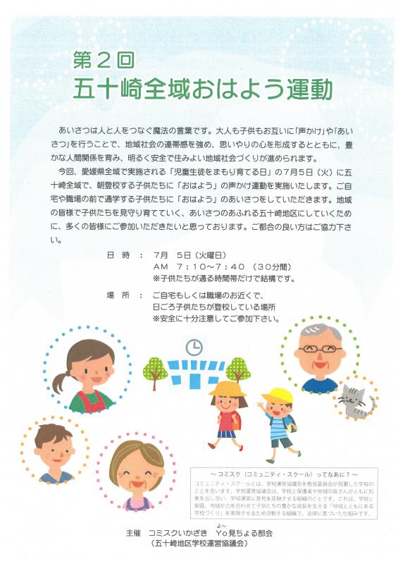 早速、7月5日(火)に、「第2回五十崎全域おはよう運動」を実施します。なお、この日は「児童生徒をまもり育てる日」及び「ふれあいの日」にもなっておりますので、当番の方はもちろんですが、ご協力いただける方は、午前7:10~7:40の間で都合のよい時間に、ご自宅近くか職場近くで子どもたちが登校する場所でご参加ください。