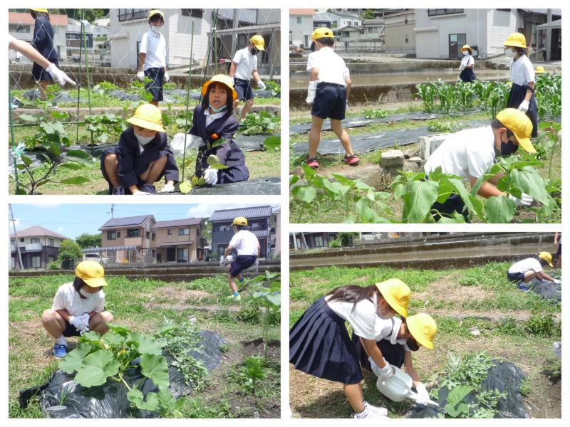 6月7日(火)の4時間目、学級園で水やりをしている2年生を発見!「先生、小さいなすができてるよ。」「カボチャに花が咲いとる。」「トウモロコシが大きくなってきた。」と、口々に報告してくれます。