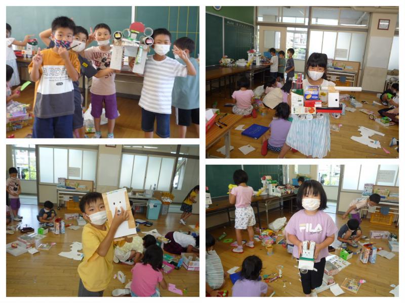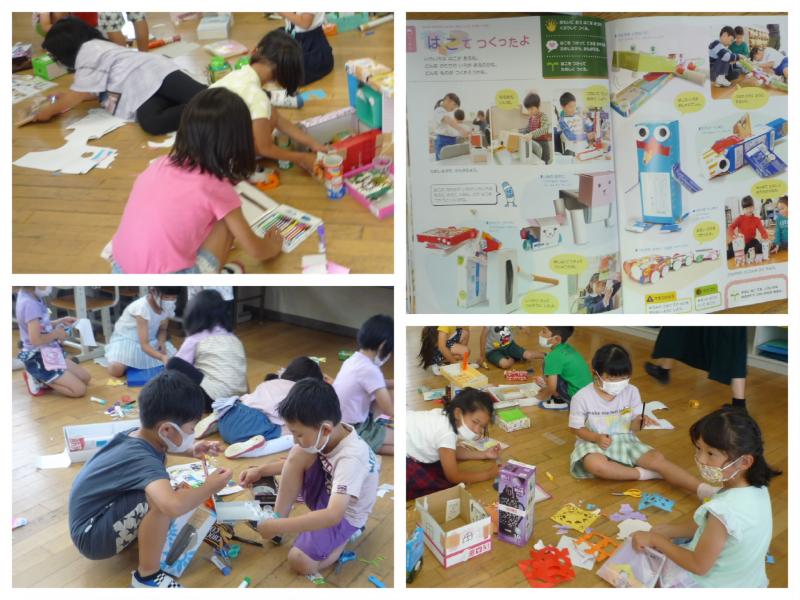 テープやのりで箱をつなげたり、飾りを付けたり、穴を開けたりするなど、友達と相談したり協力したりして、夢中で作っています。みんなそれぞれに様々な工夫を凝らして、自分が作りたいもののイメージに合った作品を作り上げていました。みんな、とっても上手ですね。そして、アイディア満載!子どもたちの発想は無限大ですね。(^^)/