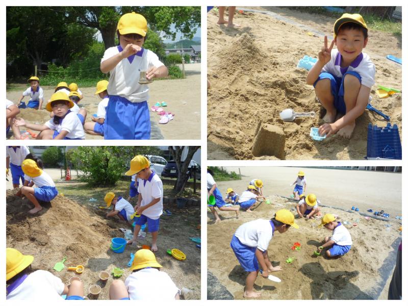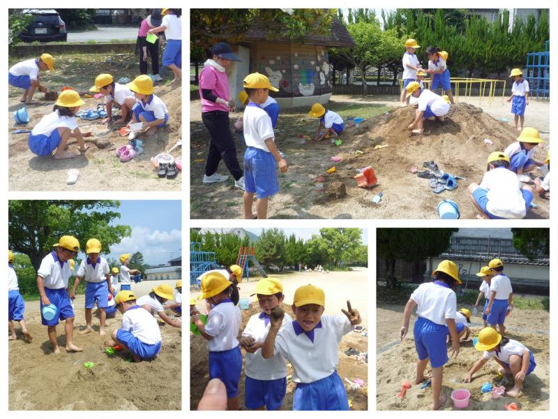 6月9日(木)の2・3時間、1年生が砂場で砂遊びを楽しみました。実際の活動では、2つのグループに分かれて、土で遊ぶグループと砂で遊ぶグループがあったのですが、どちらのグループも真剣!
