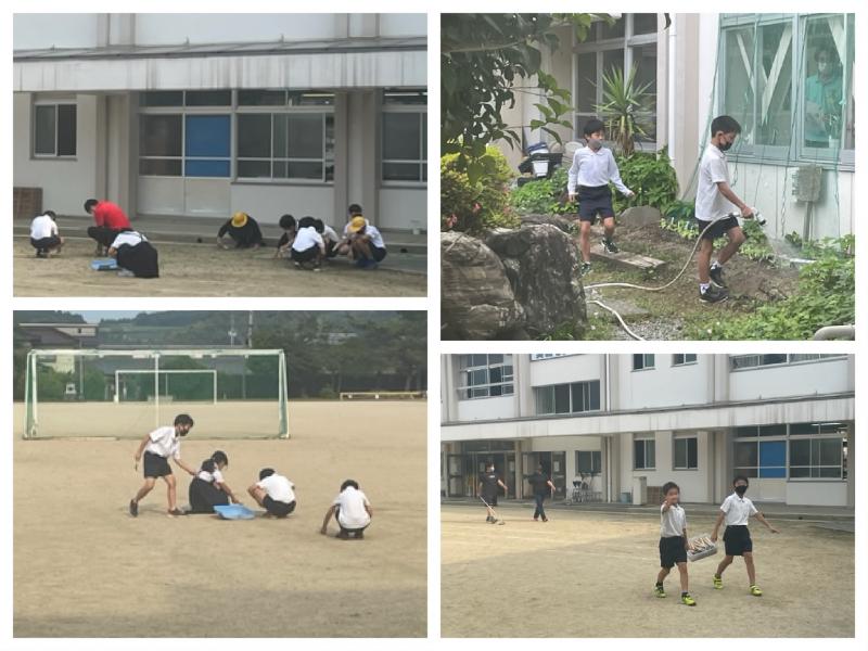 6月10日(金)、今週はまごころ週間でした。毎朝、たくさんの子どもたちが運動場の草引きなどのボランティア活動に取り組んでくれています。最近は、まごころ週間に関わらず、高学年を中心に運動場の草引きをする姿をよく見かけます。進んで道具を出したり、最後まで片付けをしてくれたり・・・、高学年のリーダーシップが育ってきていると感じられるのが本当にうれしいです。また、どの学年も自分たちの育てている植物の水やりも進んでやってくれています。
