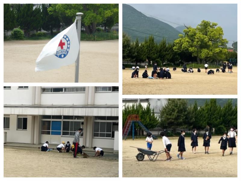 5月10日(火)、赤十字の旗が翻る中、たくさんの子どもたちが続々と朝のボランティア活動に参加してくれています。落ち葉を集めたり草を引いたり・・・、本当によく働く子どもたち。JRC精神の「気付き・考え・実行」の心意気で頑張ってくれています。ボランティア後の草引き道具の片付けを、高学年児童が率先してやってくれているのが、またうれしいです。天神小学校のよい伝統となるといいですね。(*^_^*)