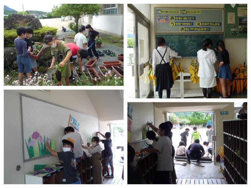 5月11日(水)の6時間目は、委員会活動です。これは5・6年生の活動です。その様子が「やる気」にあふれていて気持ちいいので、ちょっと紹介。栽培・園芸委員会は、プランターや植え込みの手入れ、放送・掲示委員会は児童玄関の掲示を頑張ってくれています。他にもたくさんの委員会で、子どもたち意欲的に活動しているのですが、全部紹介できなくてすみません。
