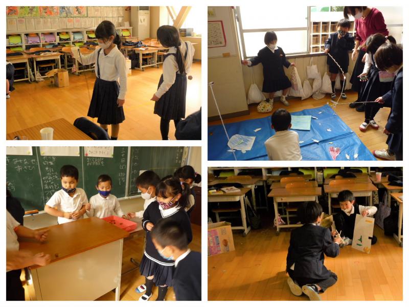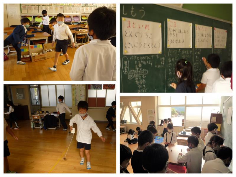 11月30日(火)、「1年生が自分たちで作ったおもちゃで遊んでますよ。」という、楽しそうなニュースが飛び込んで来ました。そこで、4時間目に1年生の教室をのぞいてみると・・・、松ぼっくりと紙コップで作った「けん玉」、オナモミと毛糸、木の棒、紙で作った魚を組み合わせた「さかなつり」、どんぐりで作った「こま」、どんぐりボールを投げ入れて点数を競う「まといれ」などで、それはそれは楽しそうに遊んでいる1年生を発見!「けん玉やってみてください。」「さかなつりしませんか?」「こまを回してみませんか?」「まといれどうぞ。」というかわいいお誘いの声。ついつい童心に返り楽しんでしまいました。(^_^)v1年生と一緒に秋を満喫させていただいた至福の時間でした。