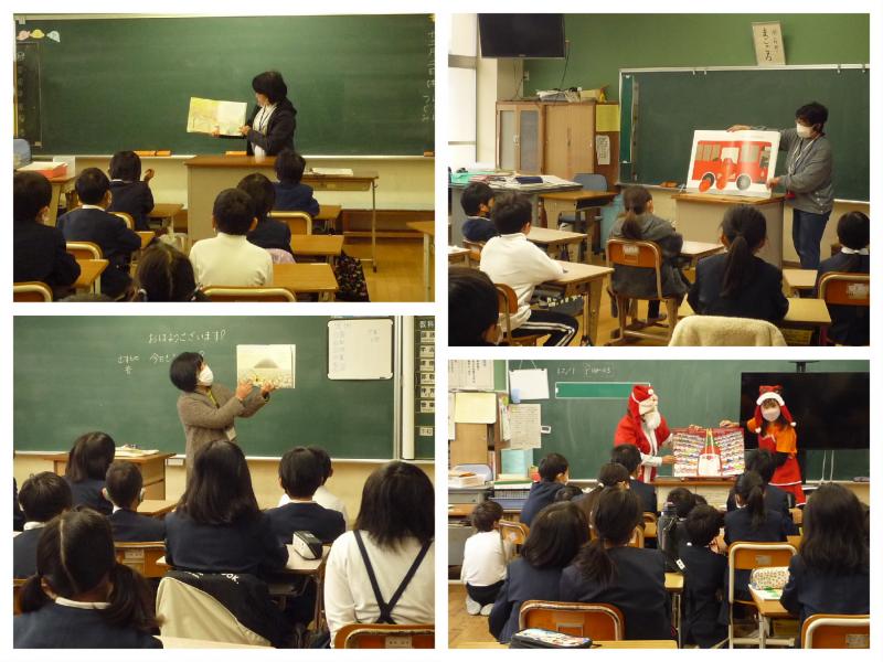 4年生の教室には、なんとサンタの衣装を身につけて登場したメンバーによる読み聞かせが!絵本のサンタさんのお話です。途中、ミニ劇も盛り込まれ、子どもたちの目も一層輝きます。