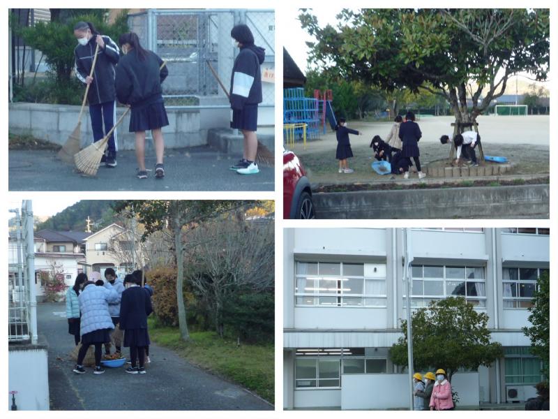 12月9日(木)、今週は「まごころ週間」です。まごころ委員会の子どもたちが「青少年赤十字の旗」を掲揚してくれています。そして、たくさんの子どもたちが朝のボランティア活動に参加しています。落ち葉を掃き集めたり、草を引いたりと、寒さに負けず活動してくれています。